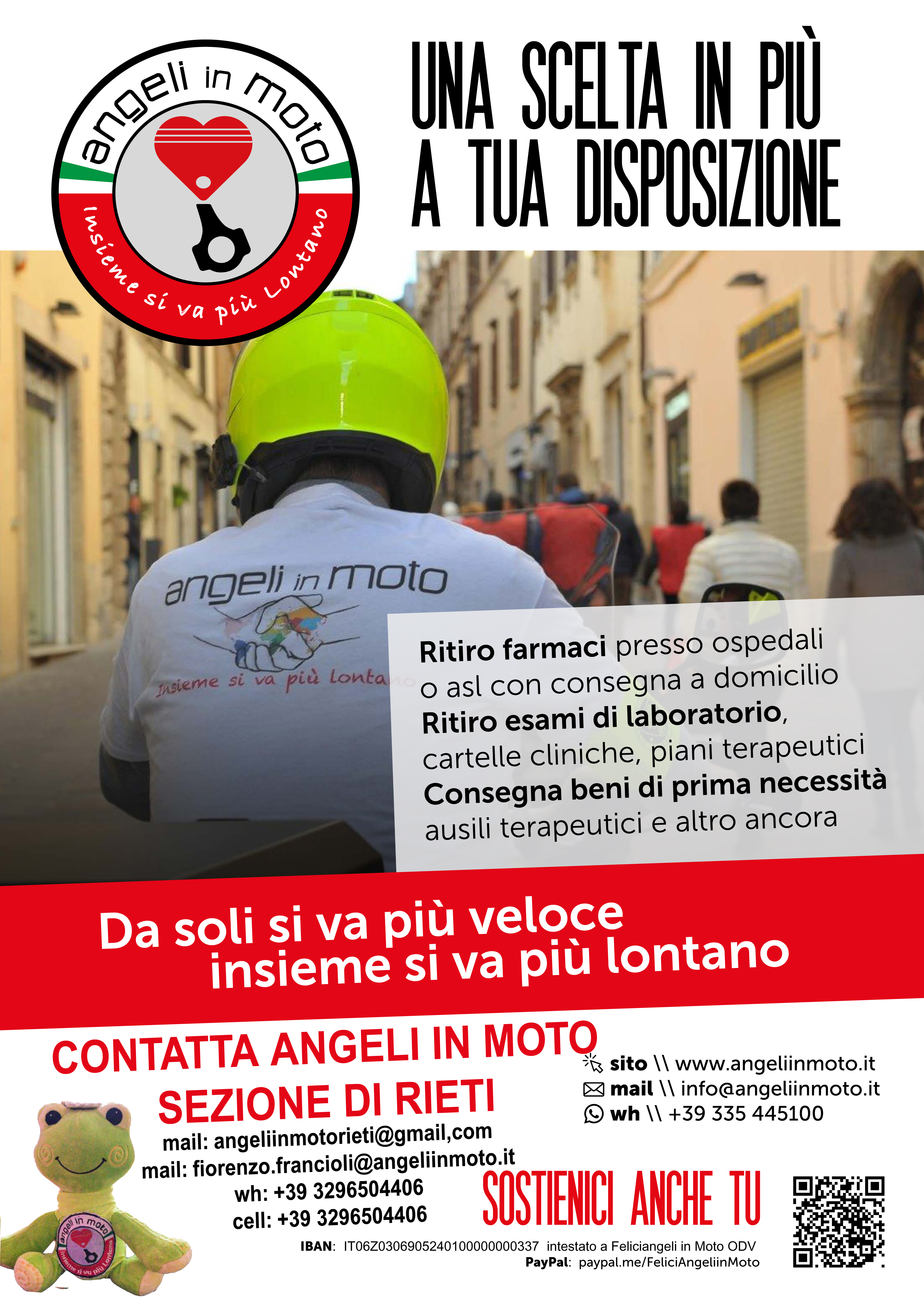 - Consegna Farmaci e Presidi: I volontari di Angeli in Moto ritireranno farmaci e materiale sanitario presso la Farmacia Ospedaliera Unica centralizzata della ASL RIETI, con la quale vige un protocollo d’intesa specifico, e li consegneranno direttamente al domicilio dei destinatari aventi diritto.
